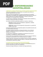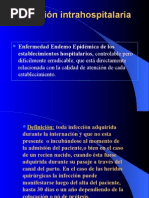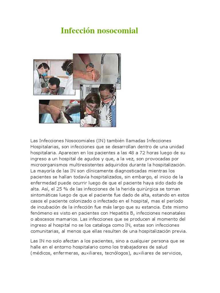 Las Infecciones Nosocomiales (IN) tambin llamadas Infecciones Hospitalarias, son infecciones que se desarrollan dentro de una unidad hospitalaria. Aparecen en los pacientes a las 48 a 72 horas luego de su ingreso a un hospital de agudos y que, a la vez, son provocadas por microorganismos multiresistentes adquiridos durante la hospitalizacin. La mayora de las IN son clnicamente diagnosticadas mientras los pacientes se hallan todava hospitalizados, sin embargo, el inicio de la enfermedad puede ocurrir luego de que el paciente haya sido dado de alta. As, el 25 % de las infecciones de la herida quirrgica se tornan sintomticas luego de que el paciente fue dado de alta, estando en estos casos el paciente colonizado o infectado en el hospital, mas el perodo de incubacin de la infeccin fue ms largo que su estancia. Este mismo fenmeno es visto en pacientes con Hepatitis B, infecciones neonatales o abscesos mamarios. Las infecciones que se producen al momento del ingreso al hospital no se los cataloga como IN, estas son infecciones comunitarias, al menos que ellas resulten de una hospitalizacin previa. Las IN no solo afectan a los pacientes, sino a cualquier persona que se halle en el entorno hospitalario como los trabajadores de salud (mdicos, enfermeras, auxiliares, tecnlogos), auxiliares de servicios,
