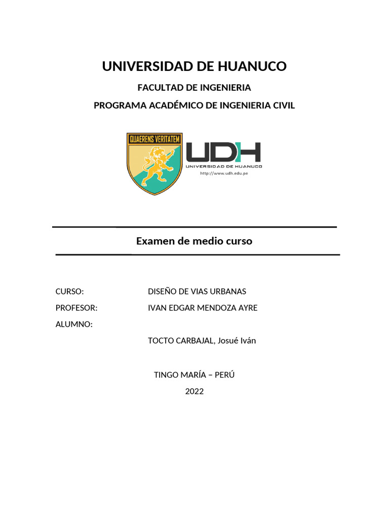 EXAMEN DE MEDIO CURSO DE DISEÑO DE VÍAS URBANAS