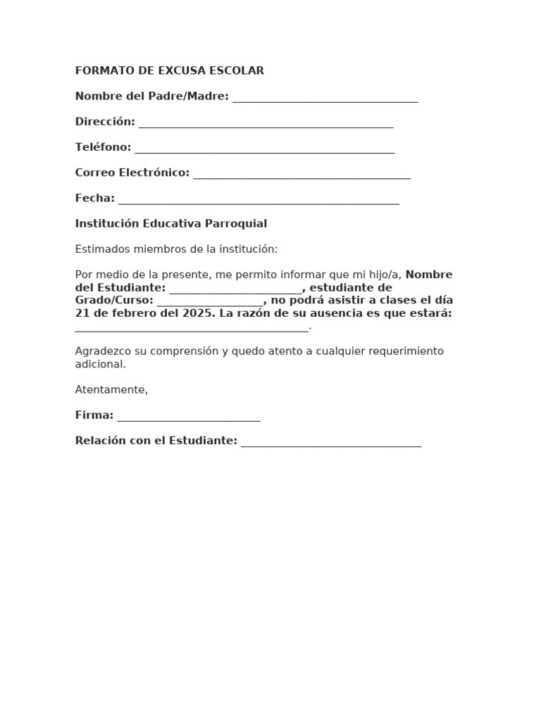 Grado/Curso: ____________________, no podrá asistir a clases el día