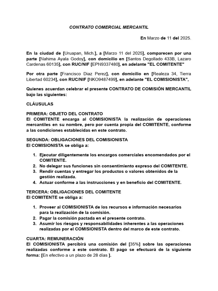 Libertad 60234], con RUC/NIF [NKO9487499], en adelante "EL COMISIONISTA",