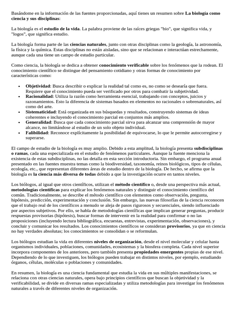 Basándome en la información de las fuentes proporcionadas, aquí tienes un resumen sobre La biología como