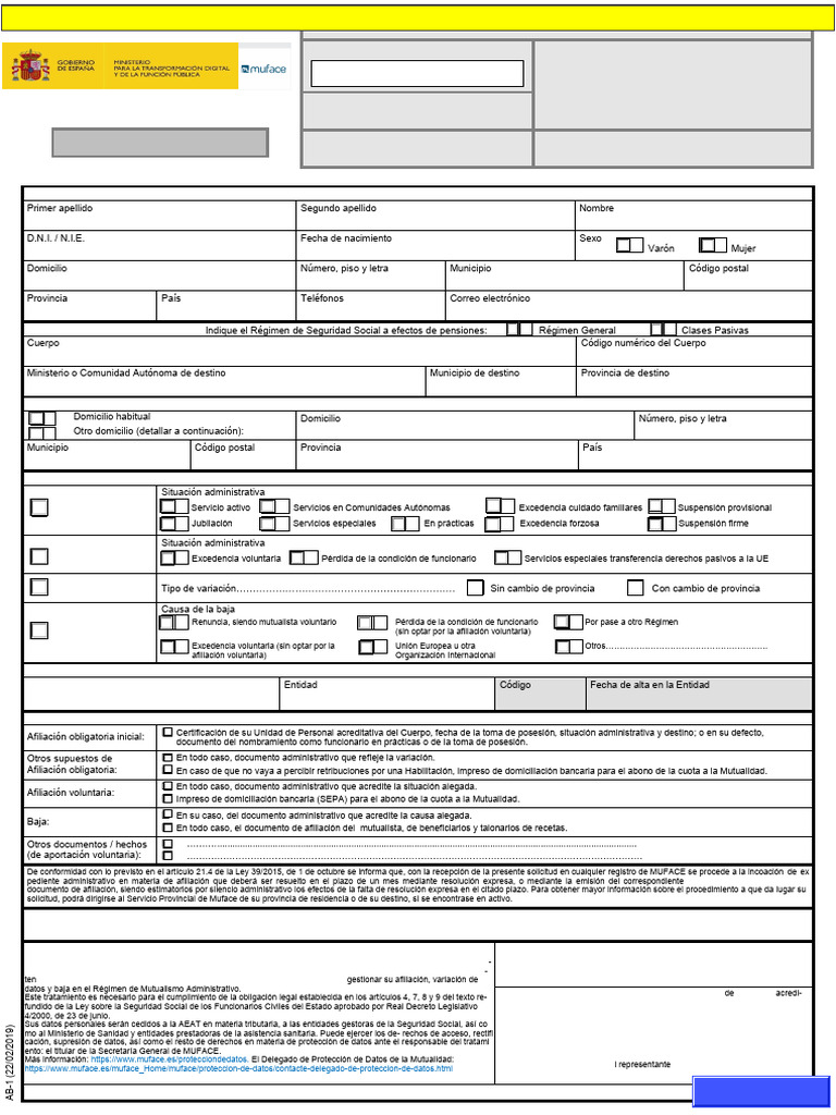 ten mediante el presente formulario serán tramitados por MUFACE con la finalidad de gestionar su afiliación, variación de