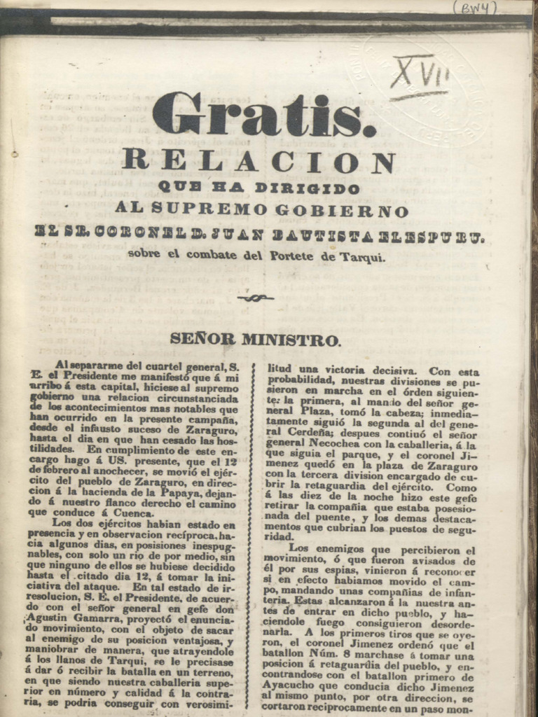 El documento detalla una relación de los acontecimientos en el combate del Portete de Tarqui, donde se describe la estrategia y movimientos de las tropas bajo el mando del general Plaza. A pesar de la resistencia inicial, las fuerzas enfrentaron dificultades y se vieron superadas por el enemigo, lo que llevó a una junta de guerra que decidió buscar un convenio preliminar de paz. Las pérdidas fueron significativas, incluyendo la muerte de oficiales y un gran número de soldados entre muertos y prisioneros.