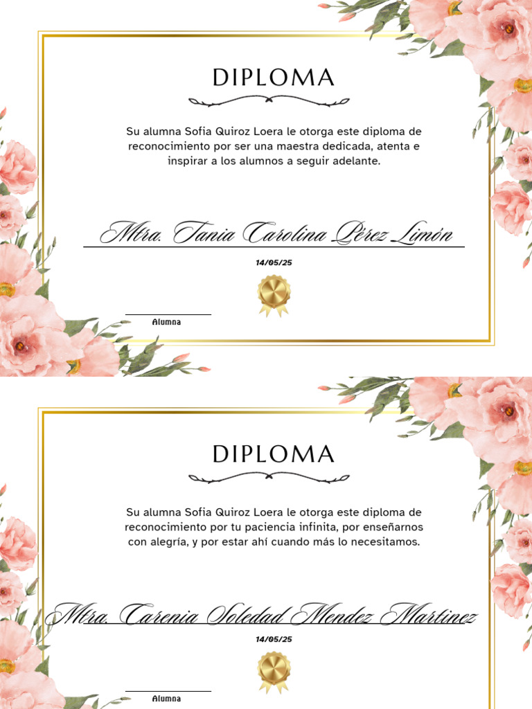 Su alumna Sofia Quiroz Loera le otorga este diploma de