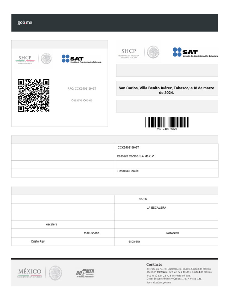 RFC: CCK240315HGT San Carlos, Villa Benito Juárez, Tabasco; a 18 de marzo