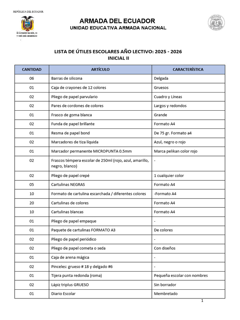 LISTA DE ÚTILES ESCOLARES AÑO LECTIVO: 2025 - 2026
