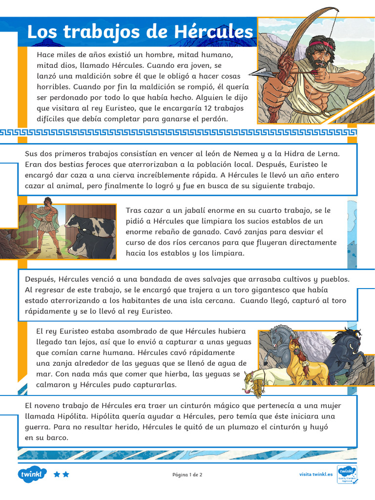 8. Resume la historia de los trabajos de Hércules en un máximo de 25 palabras.