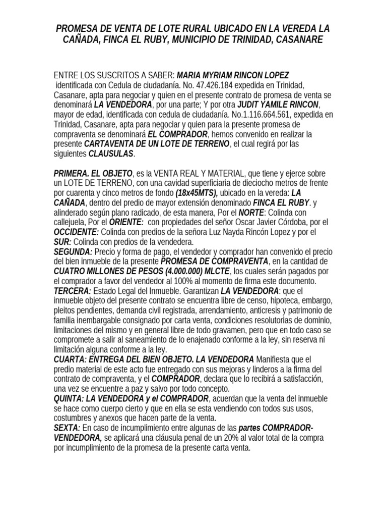 PROMESA DE VENTA DE LOTE RURAL UBICADO EN LA VEREDA LA