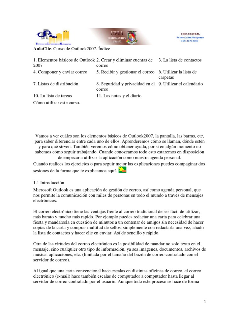 Componer y enviar correo 5. Recibir y gestionar el correo 6. Utilizar la lista de carpetas 7. Listas de distribucin 8. Seguridad y privacidad en el 9. Utilizar el calendario correo 10. La lista de tareas 11. Las notas y el diario Cmo utilizar este curso.