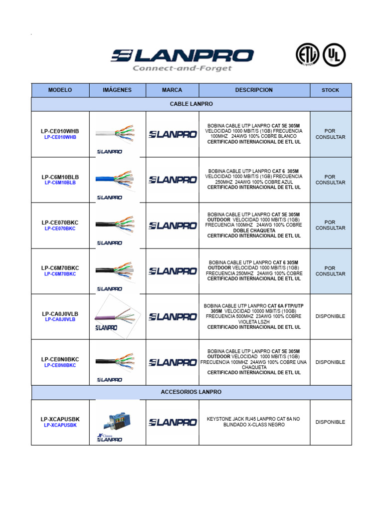 LP-CE0N0BKC FRECUENCIA 100MHZ 24AWG 100% COBRE UNA DISPONIBLE