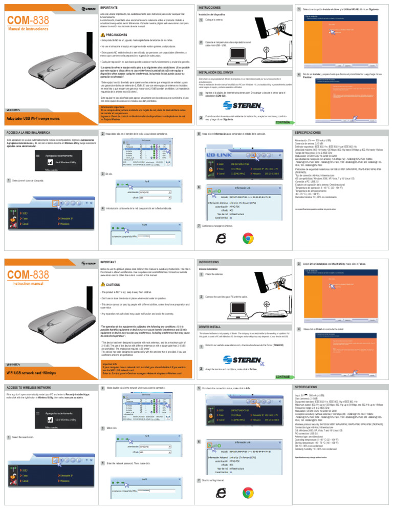 2.15 dBi. The use of this device with different antennas or with a bigger gain than 2.15 dBi Enter to our website www.steren.com, download and execute the Driver (COM-838)