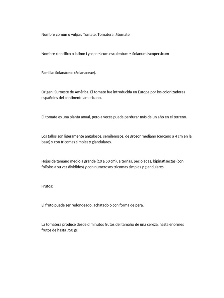 Nombre común o vulgar: Tomate, Tomatera, Jitomate