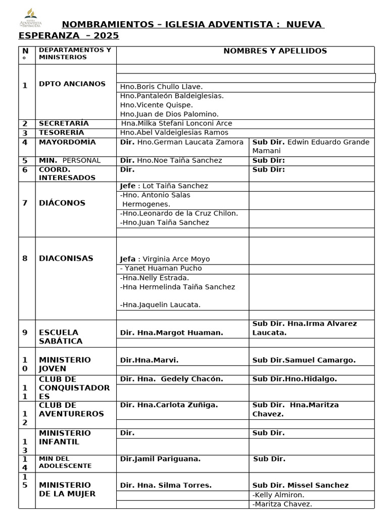 NOMBRAMIENTOS – IGLESIA ADVENTISTA :