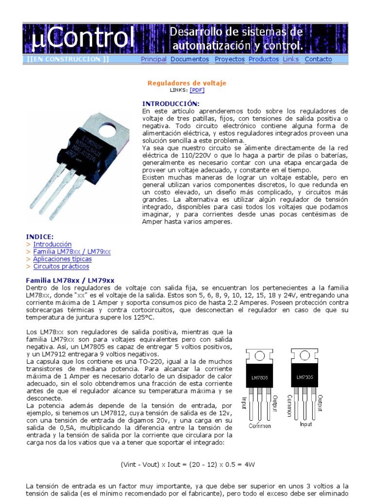 INTRODUCCIN: En este artculo aprenderemos todo sobre los reguladores de voltaje de tres patillas, fijos, con tensiones de salida positiva o negativa. Todo circuito electrnico contiene alguna forma de alimentacin elctrica, y estos reguladores integrados proveen una solucin sencilla a este problema. Ya sea que nuestro circuito se alimente directamente de la red elctrica de 110/220V o que lo haga a partir de pilas o bateras, generalmente es necesario contar con una etapa encargada de proveer un voltaje adecuado, y constante en el tiempo. Existen muchas maneras de lograr un voltaje estable, pero en general utilizan varios componentes discretos, lo que redunda en un costo elevado, un diseo ms complicado, y circuitos ms grandes. La alternativa es utilizar algn regulador de tensin integrado, disponibles para casi todos los voltajes que podamos imaginar, y para corrientes desde unas pocas centsimas de Amper hasta varios amperes. INDICE: > Introduccin > Familia LM78xx / LM79xx > Aplicaciones tpicas > Circuitos prcticos Familia LM78xx / LM79xx Dentro de los reguladores de voltaje con salida fija, se encuentran los pertenecientes a la familia LM78xx, donde xx es el voltaje de la salida. Estos son 5, 6, 8, 9, 10, 12, 15, 18 y 24V, entregando una corriente mxima de 1 Amper y soporta consumos pico de hasta 2.2 Amperes. Poseen proteccin contra sobrecargas trmicas y contra cortocircuitos, que desconectan el regulador en caso de que su temperatura de juntura supere los 125C. Los LM78xx son reguladores de salida positiva, mientras que la familia LM79xx son para voltajes equivalentes pero con salida negativa. As, un LM7805 es capaz de entregar 5 voltios positivos, y un LM7912 entregara 9 voltios negativos. La capsula que los contiene es una TO-220, igual a la de muchos transistores de mediana potencia. Para alcanzar la corriente mxima de 1 Amper es necesario dotarlo de un disipador de calor adecuado, sin el solo obtendremos una fraccin de esta corriente antes de que el regulador alcance su temperatura mxima y se desconecte. La potencia adems depende de la tensin de entrada, por ejemplo, si tenemos un LM7812, cuya tensin de salida es de 12v, con una tensin de entrada de digamos 20v, y una carga en su salida de 0,5A, multiplicando la diferencia entre la tensin de entrada y la tensin de salida por la corriente que circulara por la carga nos da los vatios que va a tener que soportar el integrado: