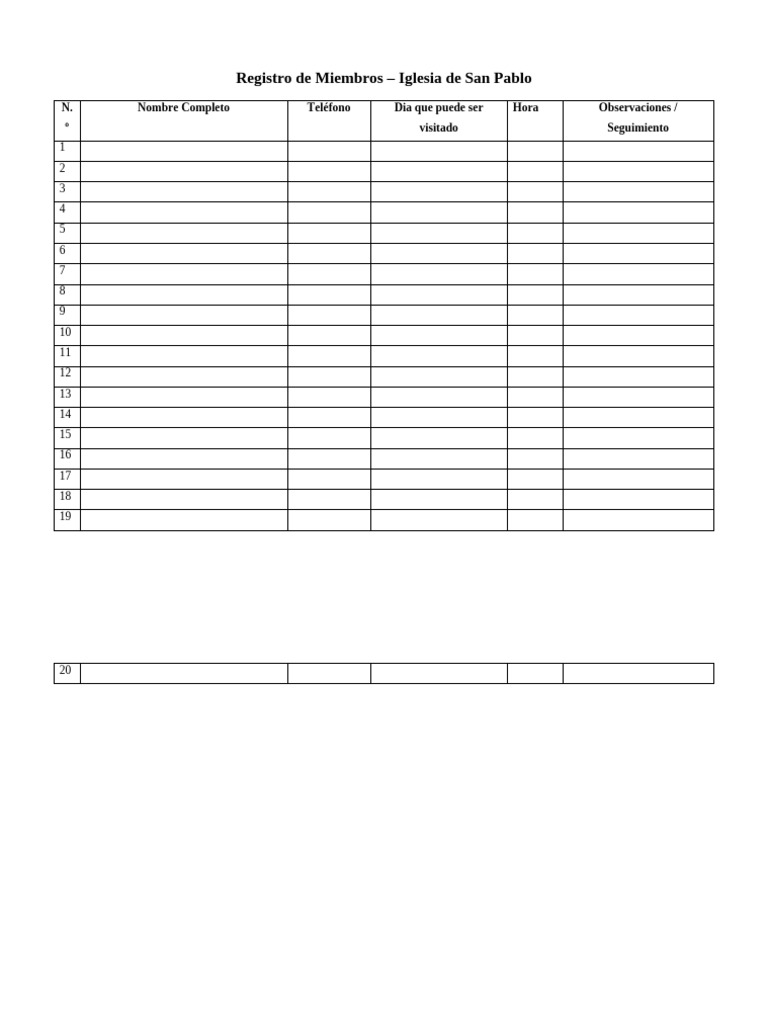 El documento es un registro de miembros de la Iglesia de San Pablo. Incluye columnas para el nombre completo, teléfono, día y hora de visita, así como observaciones y seguimiento. Actualmente, las filas están vacías y no contienen información específica.