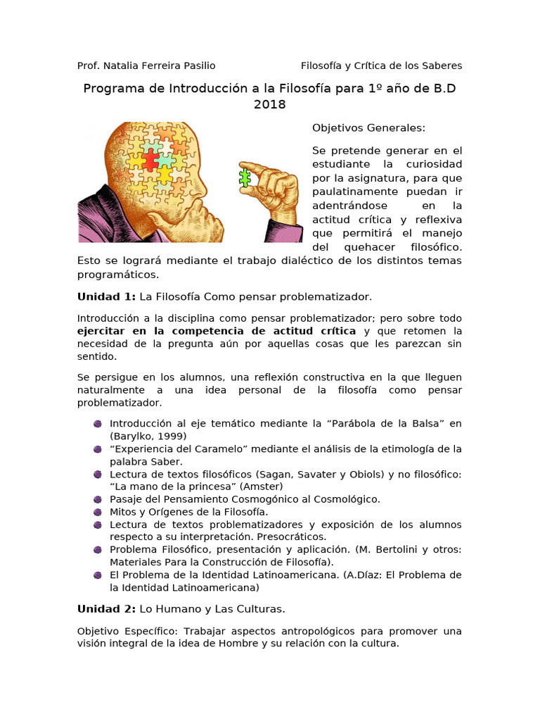 Programa de Introducción a la Filosofía para 1º año de B.D