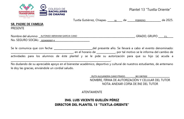 actividades para los alumnos de éste plantel y se le pide su autorización para que su hijo (a) acuda a