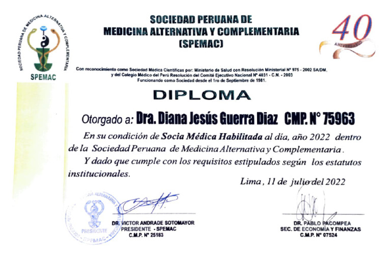 Otorgado a: Dra. Diana Jesús Guerra Diaz CMP.N° 75963