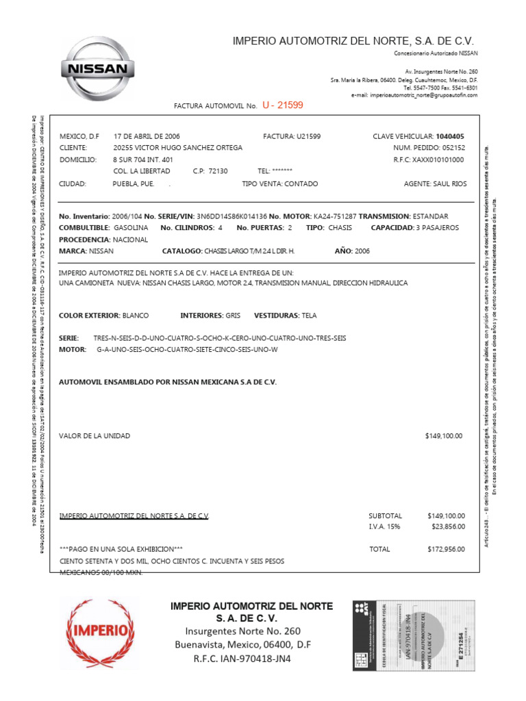 MEXICO, D.F 17 DE ABRIL DE 2006 FACTURA: U21599 CLAVE VEHICULAR: 1040405
