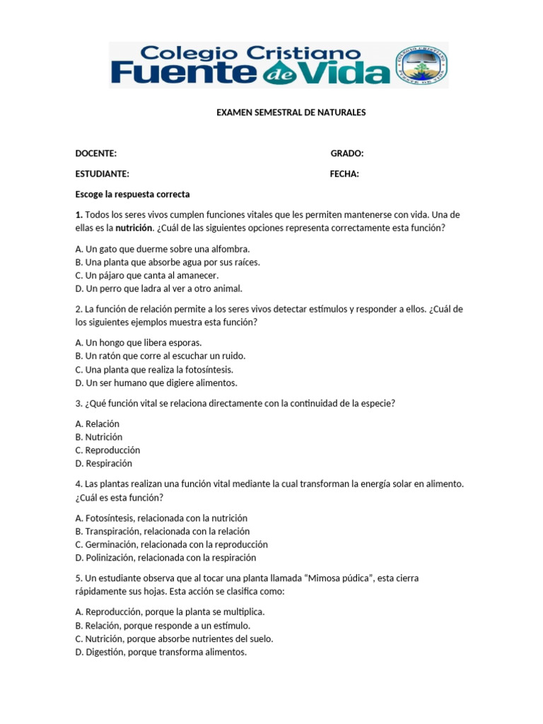 EXAMEN SEMESTRAL DE NATURALES