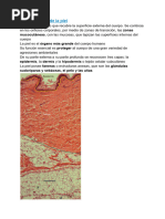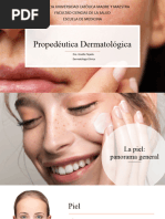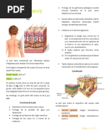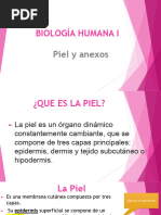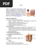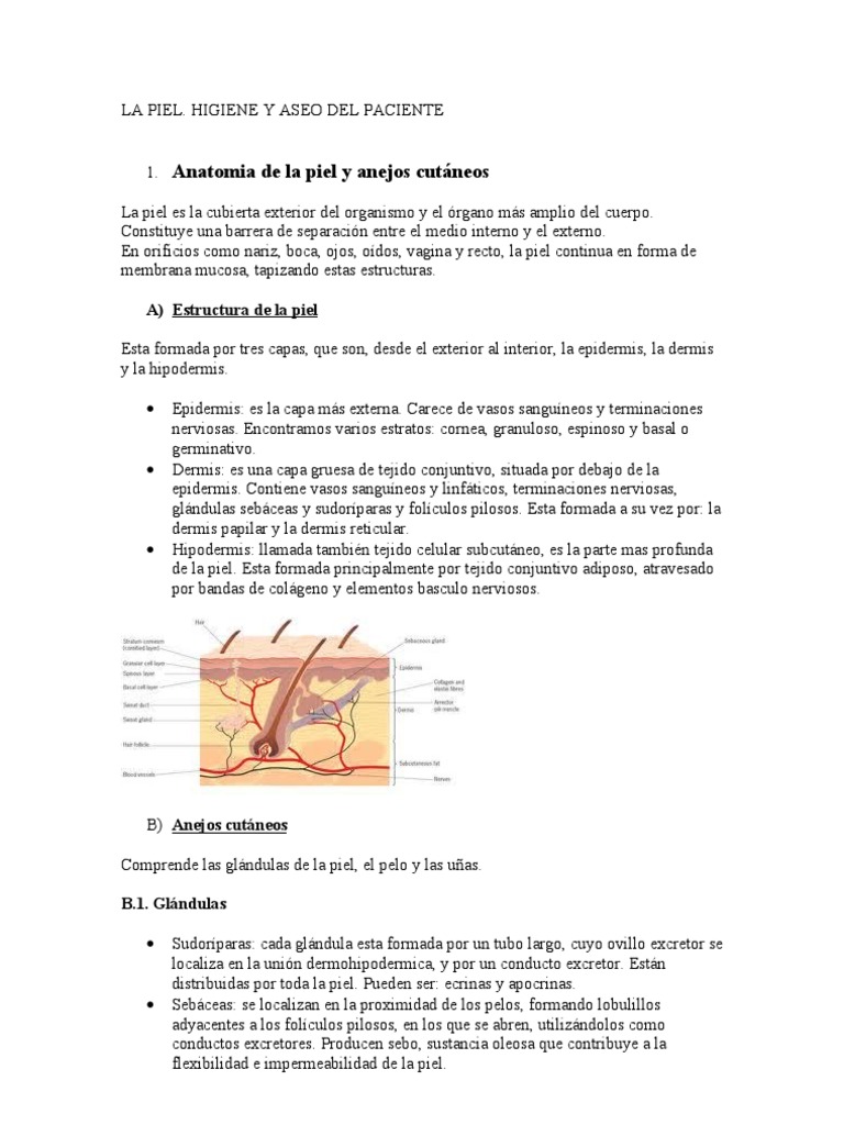 Anatomia de la piel y anejos cutneos La piel es la cubierta exterior del organismo y el rgano ms amplio del cuerpo. Constituye una barrera de separacin entre el medio interno y el externo. En orificios como nariz, boca, ojos, odos, vagina y recto, la piel continua en forma de membrana mucosa, tapizando estas estructuras. A) Estructura de la piel Esta formada por tres capas, que son, desde el exterior al interior, la epidermis, la dermis y la hipodermis. Epidermis: es la capa ms externa. Carece de vasos sanguneos y terminaciones nerviosas. Encontramos varios estratos: cornea, granuloso, espinoso y basal o germinativo. Dermis: es una capa gruesa de tejido conjuntivo, situada por debajo de la epidermis. Contiene vasos sanguneos y linfticos, terminaciones nerviosas, glndulas sebceas y sudorparas y folculos pilosos. Esta formada a su vez por: la dermis papilar y la dermis reticular. Hipodermis: llamada tambin tejido celular subcutneo, es la parte mas profunda de la piel. Esta formada principalmente por tejido conjuntivo adiposo, atravesado por bandas de colgeno y elementos basculo nerviosos.