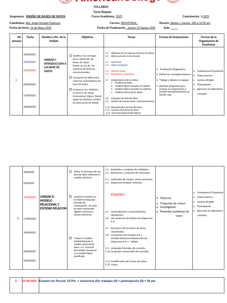 3 12/06/2025 Examen Ier Parcial. 15 Pts + asistencia (5)+ trabajos (5) + participación (5) = 30 pts