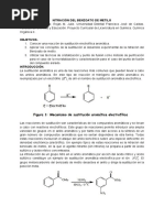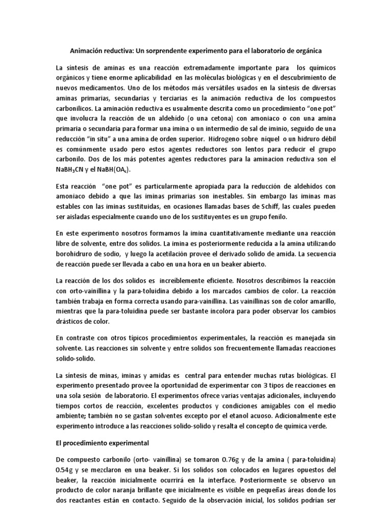 qumicos orgnicos y tiene enorme aplicabilidad en las molculas biolgicas y en el descubrimiento de nuevos medicamentos. Uno de los mtodos ms verstiles usados en la sntesis de diversas aminas primarias, secundarias y terciarias es la animacin reductiva de los compuestos carbonilicos. La aminacin reductiva es usualmente descrita como un procedimiento one pot que involucra la reaccin de un aldehdo (o una cetona) con amoniaco o con una amina primaria o secundaria para formar una imina o un intermedio de sal de iminio, seguido de una reduccin in situ a una amina de orden superior. Hidrogeno sobre nquel o un hidruro dbil es comnmente usado pero estos agentes reductores son lentos para reducir el grupo carbonilo. Dos de los ms potentes agentes reductores para la aminacion reductiva son el NaBH3CN y el NaBH(OAc). Esta reaccin one pot es particularmente apropiada para la reduccin de aldehdos con amoniaco debido a que las iminas primarias son inestables. Sin embargo las iminas mas estables con las iminas sustituidas, en ocasiones llamadas bases de Schiff, las cuales pueden ser aisladas especialmente cuando uno de los sustituyentes es un grupo fenilo. En este experimento nosotros formamos la imina cuantitativamente mediante una reaccin libre de solvente, entre dos solidos. La imina es posteriormente reducida a la amina utilizando borohidruro de sodio, y luego la acetilacin provee el derivado solido de amida. La secuencia de reaccin puede ser llevada a cabo en una hora en un beaker abierto. La reaccin de los dos solidos es increblemente eficiente. Nosotros describimos la reaccin con orto-vainillina y la para-toluidina debido a los marcados cambios de color. La reaccin tambin trabaja en forma correcta usando para-vainillina. Las vainillinas son de color amarillo, mientras que la para-toluidina puede ser bastante incolora para poder observar los cambios drsticos de color. En contraste con otros tpicos procedimientos experimentales, la reaccin es manejada sin solvente. Las reacciones sin solvente y entre solidos son frecuentemente llamadas reacciones solido-solido. La sntesis de minas, iminas y amidas es central para entender muchas rutas biolgicas. El experimento presentado provee la oportunidad de experimentar con 3 tipos de reacciones en una sola sesin de laboratorio. El experimentos ofrece varias ventajas adicionales, incluyendo tiempos cortos de reaccin, excelentes productos y condiciones amigables con el medio ambiente; tambin no se gastan solventes excepto por el etanol acuoso. Adicionalmente este experimento introduce a las reacciones solido-solido y resalta el concepto de qumica verde. El procedimiento experimental De compuesto carbonilo (orto- vainillina) se tomaron 0.76g y de la amina ( para-toluidina) 0.54g y se mezclaron en una beaker. Si los solidos son colocados en lugares opuestos del beaker, la reaccin inicialmente ocurrir en la interface. Posteriormente se observo un producto de color naranja brillante que inicialmente es visible en pequeas reas donde los dos reactantes estn en contacto. Seguido de la observacin inicial, los solidos podran ser