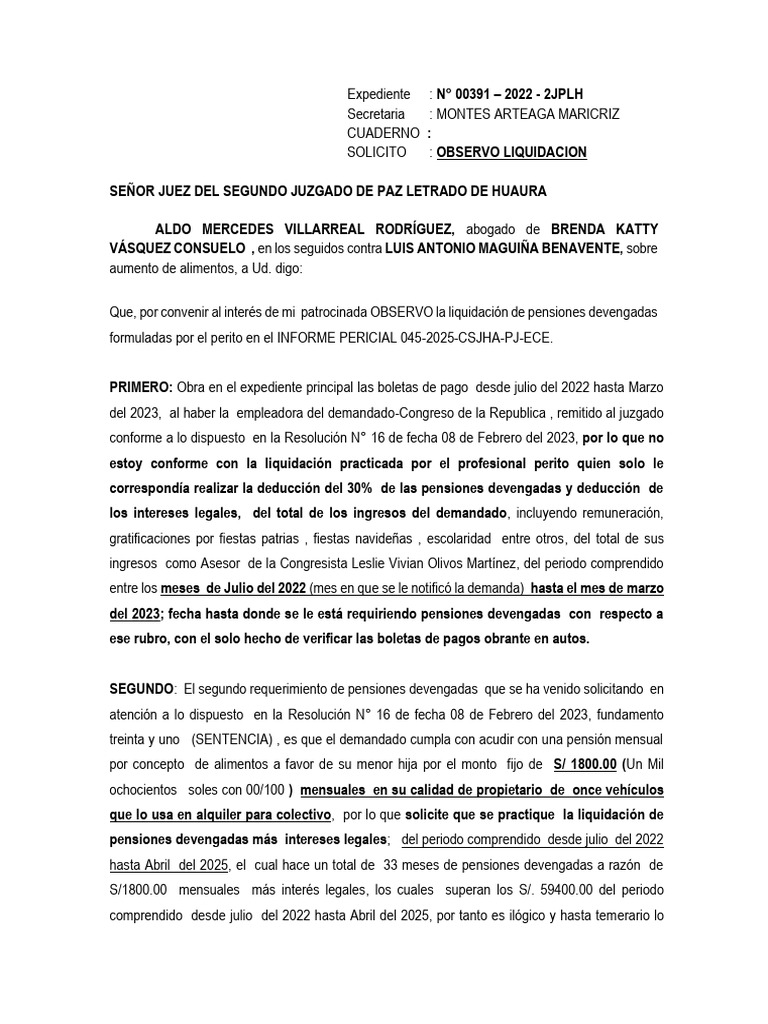 A usted señor Juez, téngase por observado la liquidación realizada en el INFORME PERICIAL