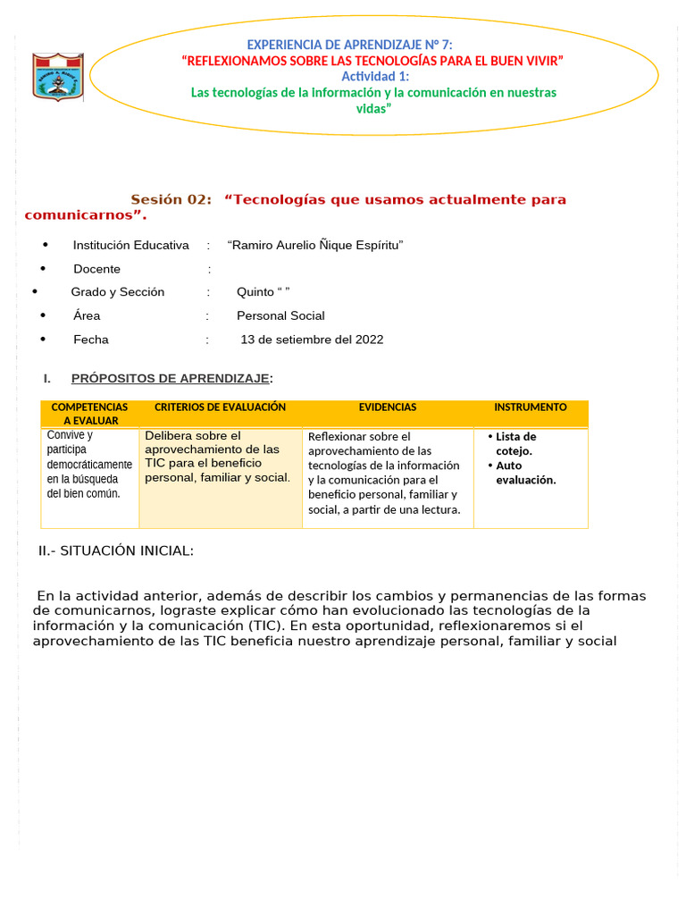 en la búsqueda personal, familiar y social. y la comunicación para el evaluación.