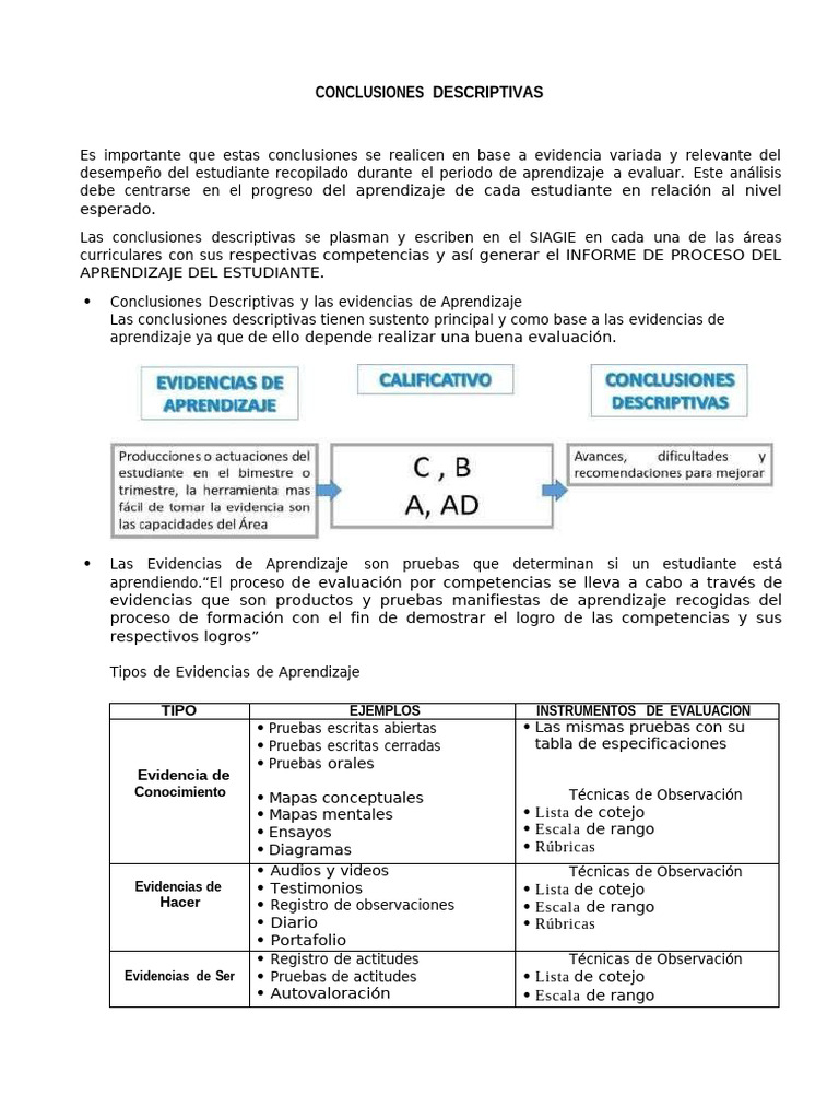 Conclusiones Descriptivas y las evidencias de Aprendizaje