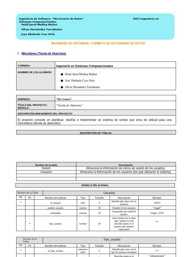 INGENIERÍA DE SOFTWARE– FORMATO DE DICCIONARIO DE DATOS