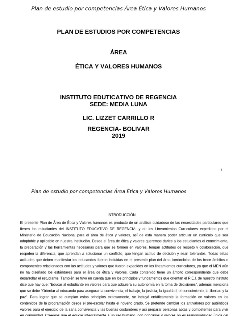 El presente Plan de Área de Ética y Valores humanos es producto de un análisis cuidadoso de las necesidades particulares que
