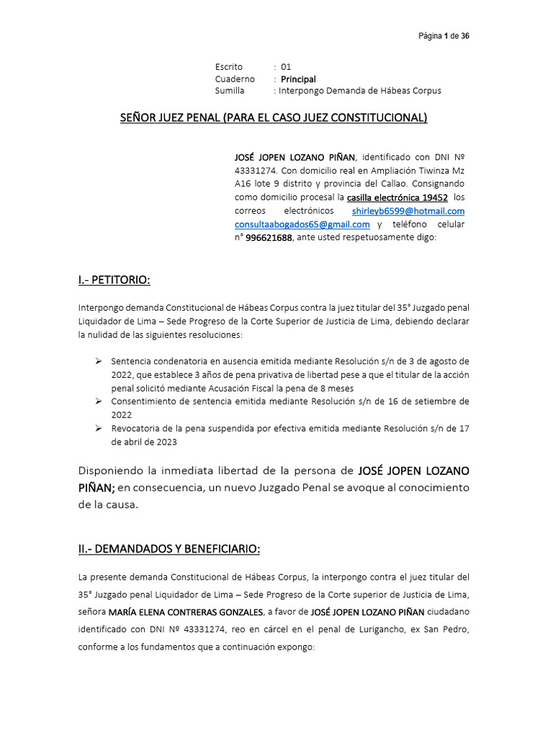 La presente demanda Constitucional de Hábeas Corpus, la interpongo contra el juez titular del