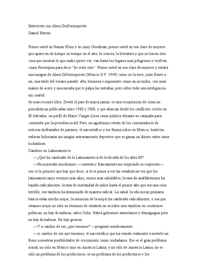 clase de mujeres que aparecen de tiempo en tiempo en el arte, la ciencia, la literatura y que no hacen otra cosa que mostrar lo que nadie quiere ver, van hasta los lugares ms peligrosos y vuelven como Proserpina para decir he visto esto. Piense usted en esa clase de mujeres y tendr una imagen de Alma Gillermoprieto (Mxico D.F. 1949) como yo la tuve, justo frente a m, una tarde del verano pasado: alta, hermosa e imponente como un incendio, con unas manos de acero y una mirada que te palpa las entraas, pero sobre todo una inteligencia sin cuartel. Su ms reciente libro, Desde el pas de nunca jams, es una recopilacin de crnicas periodsticas publicadas entre 1980 y 2008, y que abarcan desde los conflictos civiles en El Salvador, un perfil de Mario Vargas Llosa como poltico durante su campaa para contender por la presidencia del Per, un agudsimo retrato de los comentadores de noticias disfrazados de payasos, el narcotrfico y los feminicidios en Mxico, hasta las seoras bolivianas sin ningn entrenamiento deportivo que se ganan un dinero extra como luchadoras. Cambios en Latinoamrica Qu ha cambiado de la Latinoamrica de la dcada de los aos 80? Ha mejorado muchsimo contesta y francamente me sorprende su respuesta, eso es lo primero que hay que decir, si t te pones a ver las estadsticas ves que los latinoamericanos vivimos ms aos, somos ms saludables, la tasa de analfabetismo ha bajado radicalmente, la tasa de mortandad de nios hasta el primer ao que era una cosa terrible, eso tambin ha disminuido de manera radical. La salud, la educacin primaria bsica estn mucho mejor, la situacin de la mujer ha cambiado radicalmente, o sea que estamos mejor no slo en trminos de estadsticas sociales sino tambin en cuestiones polticas, no hay dictaduras, salvo Cuba. Habr gobiernos autoritarios y demagogias pero no hay dictaduras. No hay guerras. Y a cambio de eso qu tenemos? pregunto insidosamente. A cambio de eso qu tenemos, el narcotrfico que ha venido realmente a meterle un freno a nuestras posibilidades de crecimiento como ciudadanos. Ese es el gran problema actual, no slo en Mxico sino en Amrica Latina, y no slo de Amrica Latina, no es slo un problema de los productores, es un problema de los productores y los