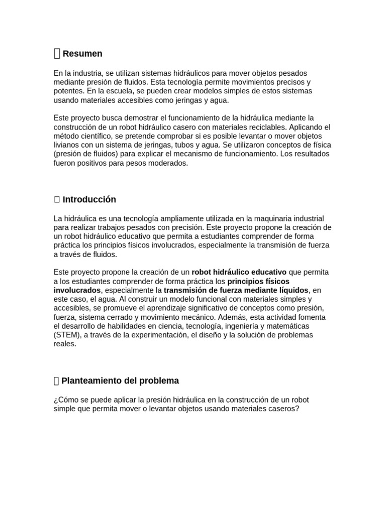 Este proyecto propone la creación de un robot hidráulico educativo que permita