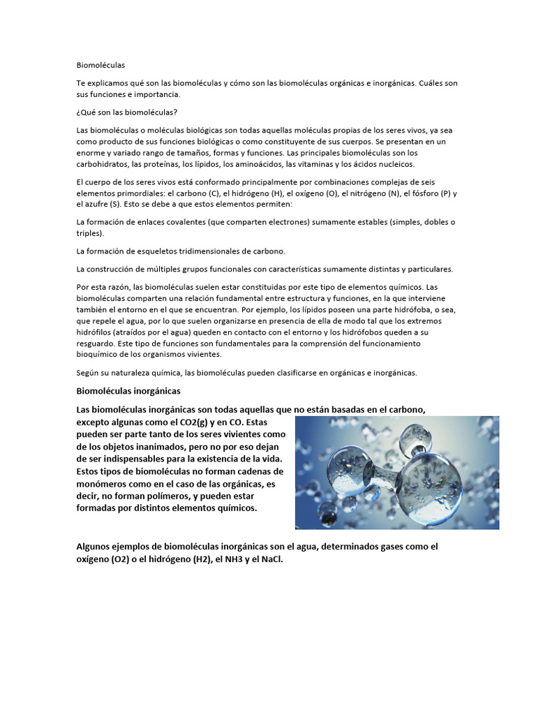 Algunos ejemplos de biomoléculas inorgánicas son el agua, determinados gases como el