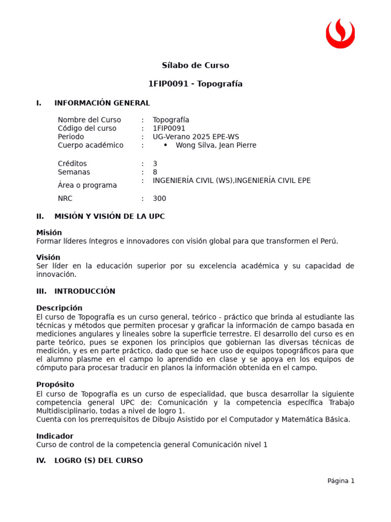 El curso de Topografía es un curso general, teórico - práctico que brinda al estudiante las