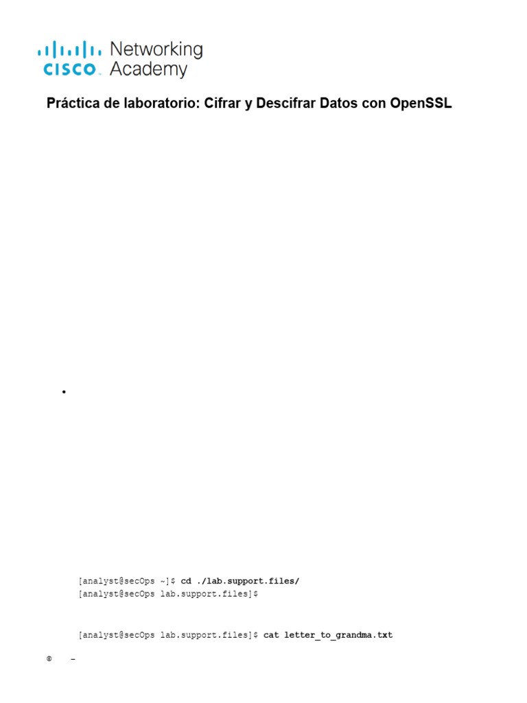 c. El archivo de texto que se debe cifrar se encuentra en el directorio /home/analyst/lab.support.files/,