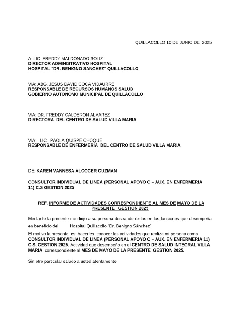 En fecha 10 de JUNIO de 2025, doy conformidad que la Aux. En enfermería KAREN