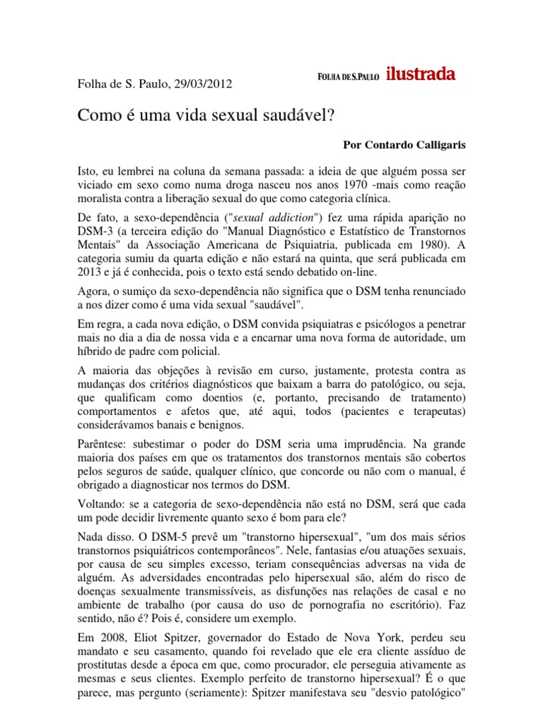 Por Contardo Calligaris Isto, eu lembrei na coluna da semana passada: a ideia de que algum possa ser viciado em sexo como numa droga nasceu nos anos 1970 -mais como reao moralista contra a liberao sexual do que como categoria clnica. De fato, a sexo-dependncia ("sexual addiction") fez uma rpida apario no DSM-3 (a terceira edio do "Manual Diagnstico e Estatstico de Transtornos Mentais" da Associao Americana de Psiquiatria, publicada em 1980). A categoria sumiu da quarta edio e no estar na quinta, que ser publicada em 2013 e j conhecida, pois o texto est sendo debatido on-line. Agora, o sumio da sexo-dependncia no significa que o DSM tenha renunciado a nos dizer como uma vida sexual "saudvel". Em regra, a cada nova edio, o DSM convida psiquiatras e psiclogos a penetrar mais no dia a dia de nossa vida e a encarnar uma nova forma de autoridade, um hbrido de padre com policial. A maioria das objees reviso em curso, justamente, protesta contra as mudanas dos critrios diagnsticos que baixam a barra do patolgico, ou seja, que qualificam como doentios (e, portanto, precisando de tratamento) comportamentos e afetos que, at aqui, todos (pacientes e terapeutas) considervamos banais e benignos. Parntese: subestimar o poder do DSM seria uma imprudncia. Na grande maioria dos pases em que os tratamentos dos transtornos mentais so cobertos pelos seguros de sade, qualquer clnico, que concorde ou no com o manual, obrigado a diagnosticar nos termos do DSM. Voltando: se a categoria de sexo-dependncia no est no DSM, ser que cada um pode decidir livremente quanto sexo bom para ele? Nada disso. O DSM-5 prev um "transtorno hipersexual", "um dos mais srios transtornos psiquitricos contemporneos". Nele, fantasias e/ou atuaes sexuais, por causa de seu simples excesso, teriam consequncias adversas na vida de algum. As adversidades encontradas pelo hipersexual so, alm do risco de doenas sexualmente transmissveis, as disfunes nas relaes de casal e no ambiente de trabalho (por causa do uso de pornografia no escritrio). Faz sentido, no ? Pois , considere um exemplo. Em 2008, Eliot Spitzer, governador do Estado de Nova York, perdeu seu mandato e seu casamento, quando foi revelado que ele era cliente assduo de prostitutas desde a poca em que, como procurador, ele perseguia ativamente as mesmas e seus clientes. Exemplo perfeito de transtorno hipersexual? o que parece, mas pergunto (seriamente): Spitzer manifestava seu "desvio patolgico"