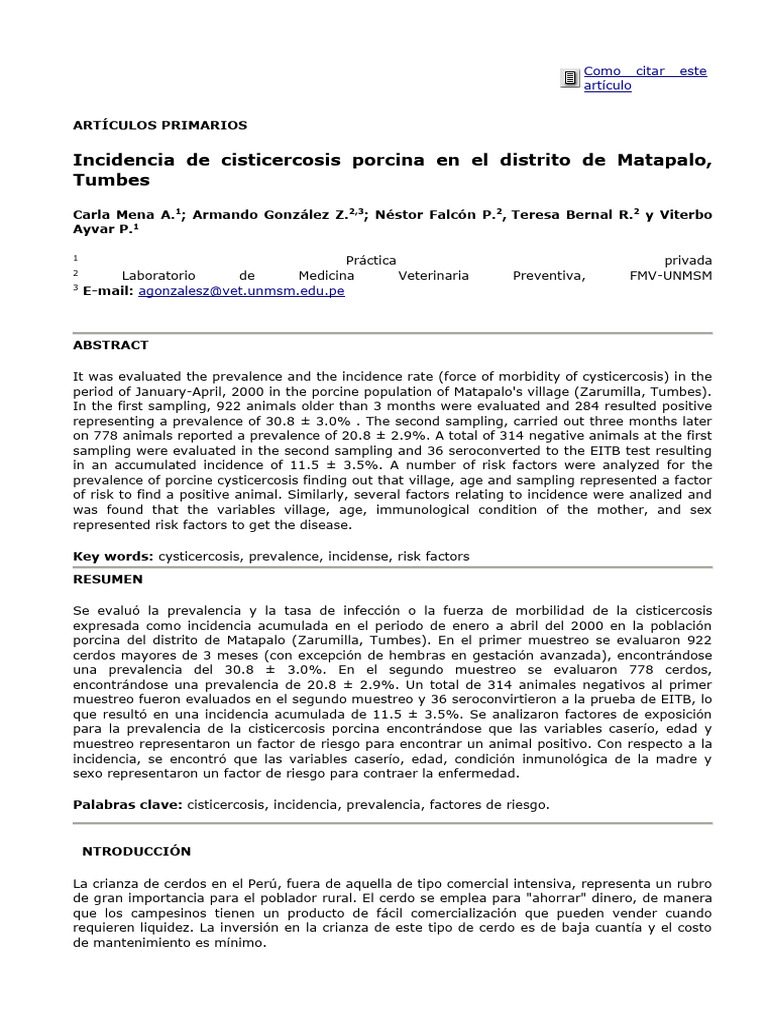 Palabras clave: cisticercosis, incidencia, prevalencia, factores de riesgo.