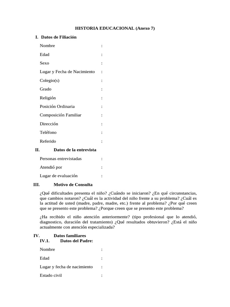 Retardo Mental: Si ( ) No ( ) Relación con el niño______________