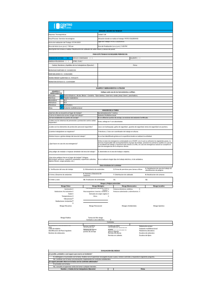 Diligenciamiento del permiso de y de alto riesgo (Alturas) que pueden causar Mala planeación del trabajo en alturas, encargada de la empresa de CENTRO NET S.A.S.