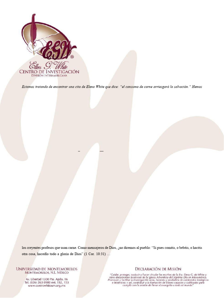 Estamos tratando de encontrar una cita de Elena White que dice: “el consumo de carne arriesgará la salvación.” Hemos