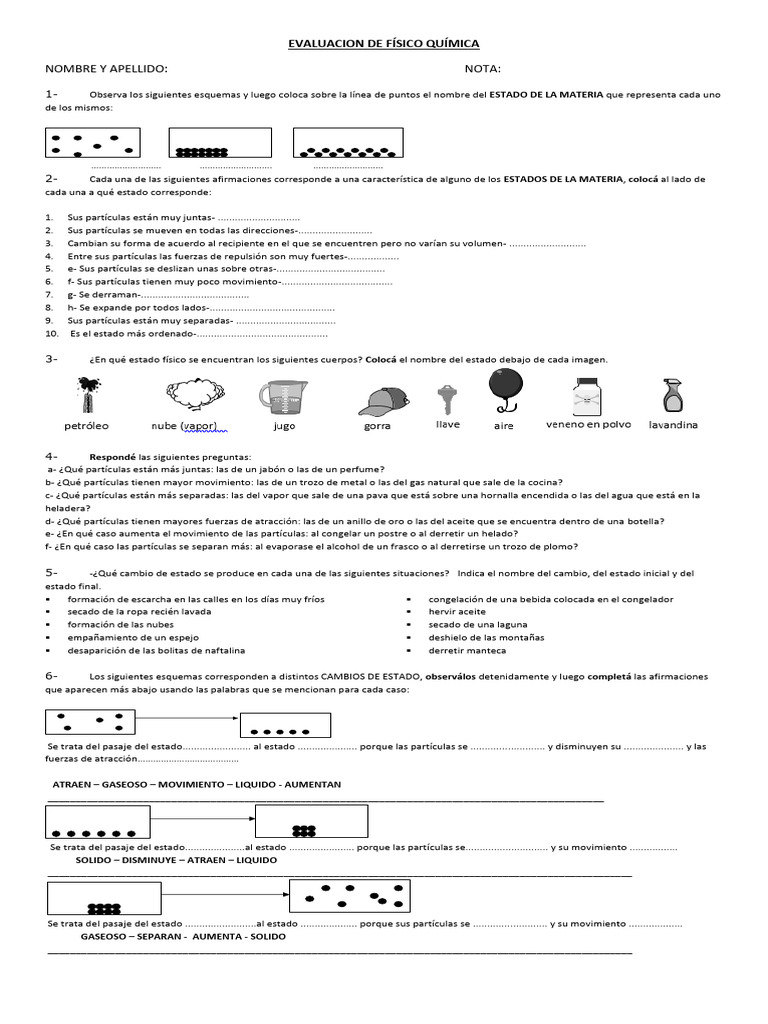 Se trata del pasaje del estado........................ al estado ..................... porque las partículas se .......................... y disminuyen su ..................... y las