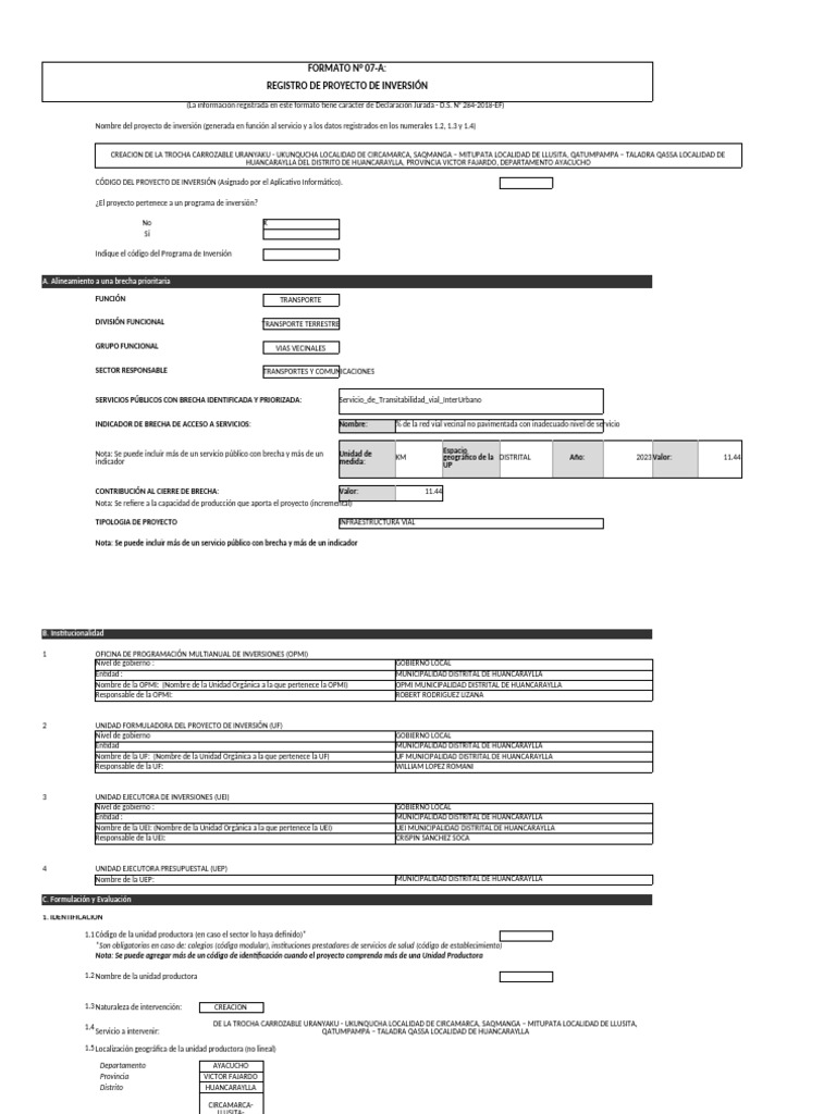REGISTRO DE PROYECTO DE INVERSIÓN