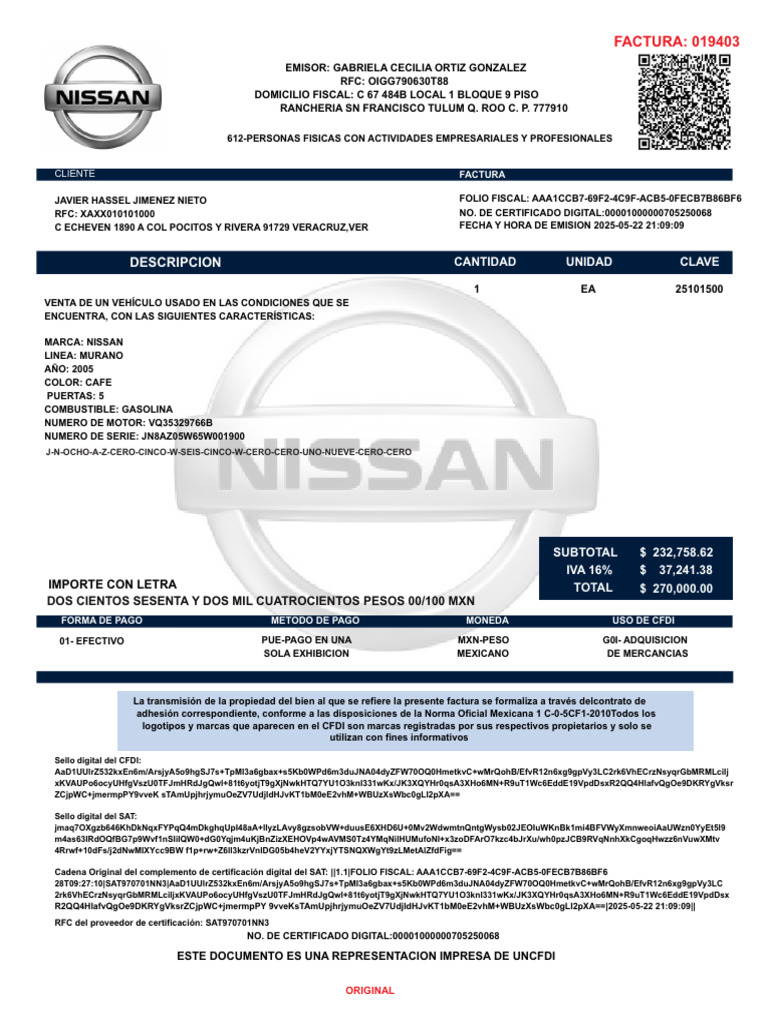C ECHEVEN 1890 A COL POCITOS Y RIVERA 91729 VERACRUZ,VER FECHA Y HORA DE EMISION 2025-05-22 21:09:09