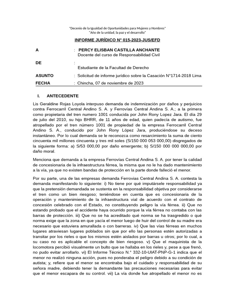 ASUNTO : Solicitud de informe jurídico sobre la Casación N°1714-2018 Lima