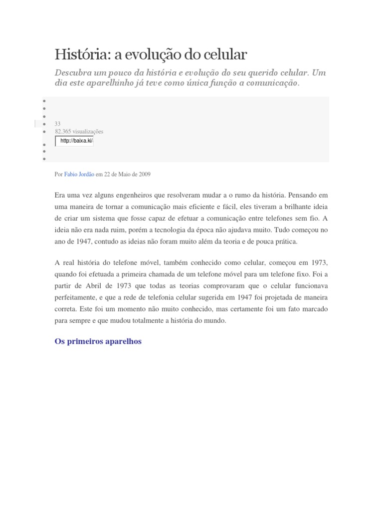 Era uma vez alguns engenheiros que resolveram mudar a o rumo da histria. Pensando em uma maneira de tornar a comunicao mais eficiente e fcil, eles tiveram a brilhante ideia de criar um sistema que fosse capaz de efetuar a comunicao entre telefones sem fio. A ideia no era nada ruim, porm a tecnologia da poca no ajudava muito. Tudo comeou no ano de 1947, contudo as ideias no foram muito alm da teoria e de pouca prtica. A real histria do telefone mvel, tambm conhecido como celular, comeou em 1973, quando foi efetuada a primeira chamada de um telefone mvel para um telefone fixo. Foi a partir de Abril de 1973 que todas as teorias comprovaram que o celular funcionava perfeitamente, e que a rede de telefonia celular sugerida em 1947 foi projetada de maneira correta. Este foi um momento no muito conhecido, mas certamente foi um fato marcado para sempre e que mudou totalmente a histria do mundo.