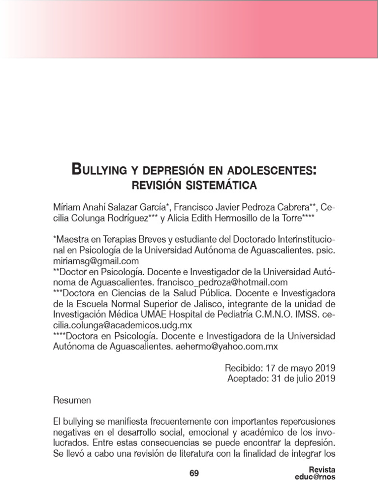 Palabras clave: Bullying, depresión, adolescentes.